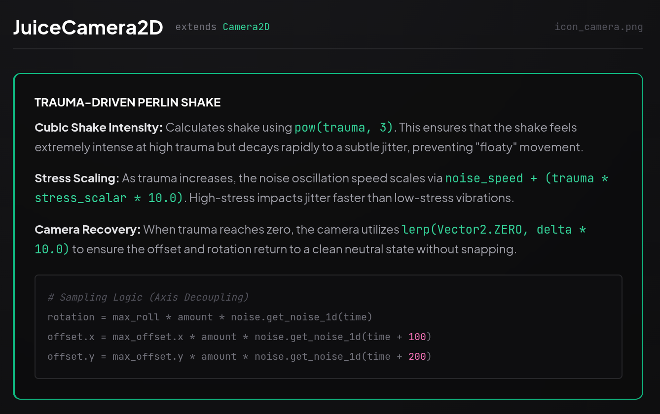 pow(trauma, 3)) for high-impact shakes that settle instantly without floating. - Stress Scaling: Oscillation frequency scales dynamically with trauma intensity.