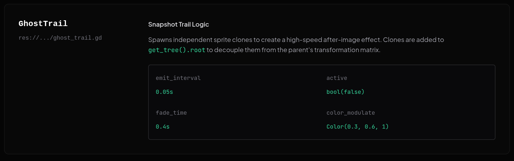 - GhostTrail: Spawns decoupled sprite copies in global space for dash/speed after-images.
