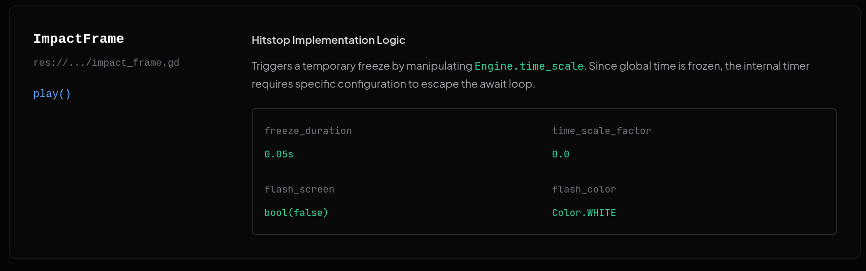 - ImpactFrame: Manages hitstop (freeze frames) by manipulating